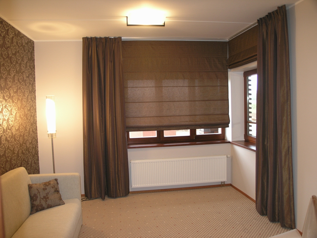 Висота стелі теж грає важливу роль. Зробити низькі стелі візуально вище допоможуть довгі портьєри. Штори римського чи лондонського типу мають невелику довжину і підійдуть для кухонь і веранд. Вони можуть виступати в ролі жалюзі.