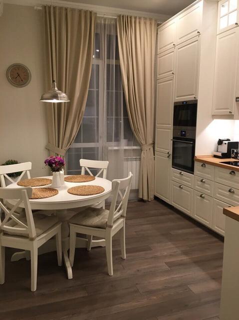 - Прежде всего, это белоснежный тюль, который никогда не устаревает. Он прекрасно дополнит мебель в кухне, впишется в декор помещения и станет отличным вариантом, вне зависимости от размера комнаты. Даже, если у вас уже висят шторы, легкие занавески из белоснежного тюля никогда не помешают, а лишь внесут дополнительный уют в кухню.